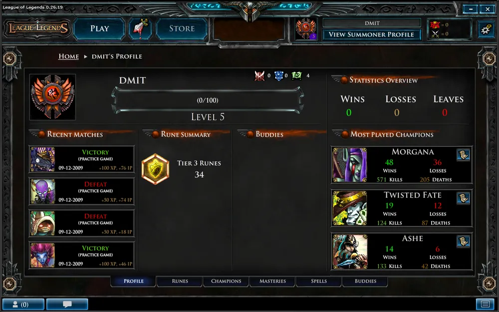 В окне вашего профиля, вся важная информация. Ваш уровень, последние матчи, самые используемые чемпионы, статистика.